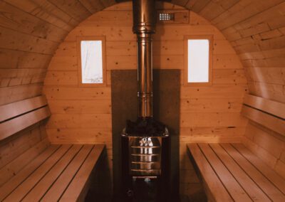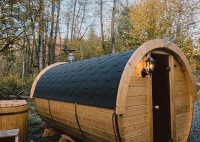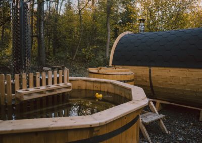 Po dni plném objevování a zážitků vás čeká zasloužený odpočinek přímo v našem glampingu. Můžete se zahřát v soukromé sauně, ponořit se do horkého koupacího sudu a nechat všechen stres odplout s teplou vodou.
